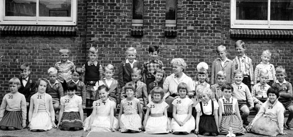 Dit is een foto volgens mij uit de eerste of tweede klas, in beide klassen was jufrouw van Engen onze lerares. Zodra de nummertjes er bij staan zal ik de namen invullen. Ik zit zelf op de middelste rij, de vierde van links (Henk Roeleveld)